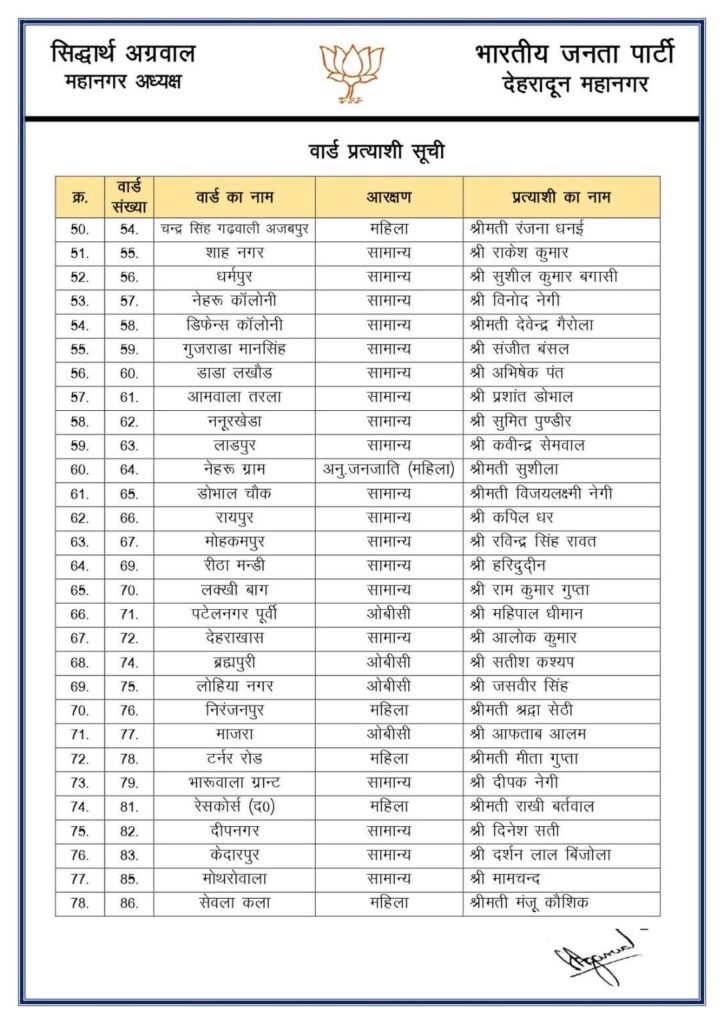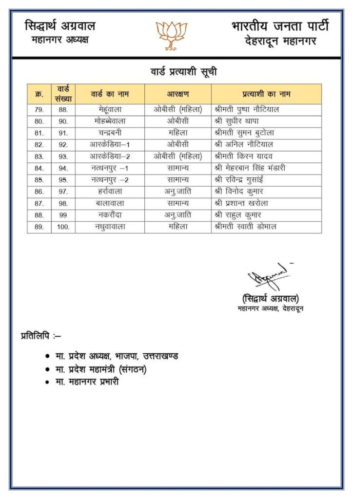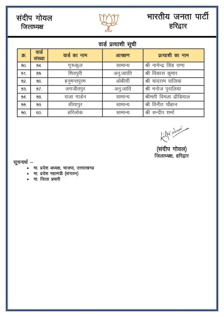 निकाय चुनाव: भाजपा ने रुड़की, हरिद्वार, देहरादून के पार्षद प्रत्याशियों के साथ ही नगर पालिका लक्सर व शिवालिक नगर सभासद प्रत्याशियों की सूची की जारी……..