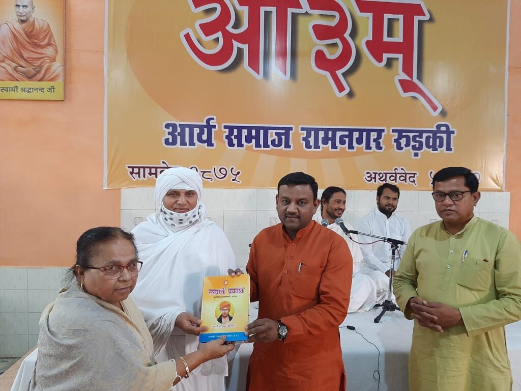 रुड़की। आर्य समाज मंदिर में 46-वां वार्षिकोत्सव बड़ी धूमधाम से मनाया गया। तीन दिन तक चले इस वार्षिकोत्सव में बड़ी तादाद में धर्म प्रेमियों ने भाग लिया।वकार्यक्रम में छोटे-छोटे बच्चों ने सुंदर वेद, भजन, गायत्री मंत्र आदि की प्रस्तुति दी तथा मैत्री कन्या गुरुकुल मुंडा खेड़ा की छात्राओं द्वारा भजन एवं वेद मंत्र का पाठ किया गया। आर्य समाज की ओर से अध्यक्ष उषा राजे ने मेयर गौरव गोयल तथा आरआईटी के चेयरमैन एसके गुप्ता,पूर्व दर्जाधारी मंत्री शोभाराम प्रजापति, प्रधान श्यामलाल तथा पूर्व मंत्री चंद्रप्रकाश को भेंट स्वरूप धार्मिक पुस्तक देकर सम्मान किया।