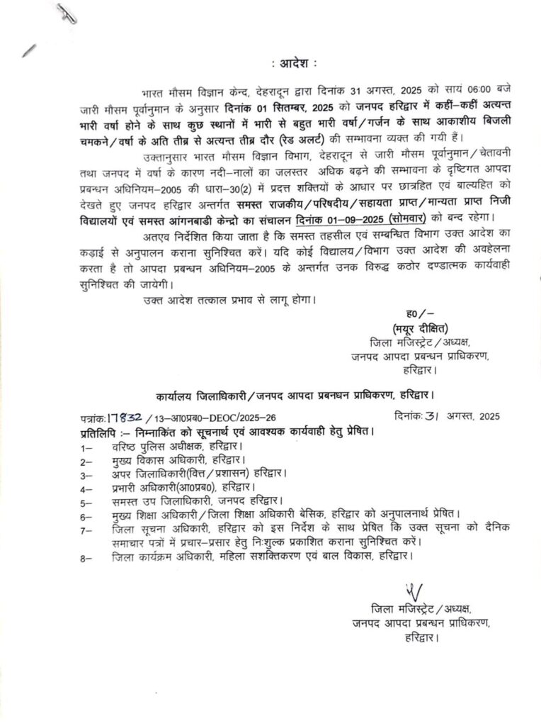 हरिद्वार। भारत मौसम विज्ञान केंद्र देहरादून द्वारा जारी मौसम पूर्व अनुमान के अनुसार 1 सितंबर दिन सोमवार को जनपद हरिद्वार में कहीं-कहीं अत्यंत भारी वर्षा होने के साथ कुछ स्थानों पर भारी वर्षा/गर्जन के साथ आकाशीय बिजली चमकने/वर्षा के तीव्र से अत्यंत तीव्र दौर (Red alert) की संभावनाएं व्यक्त की गई है जिसके चलते जिला मजिस्ट्रेट हरिद्वार मयूर दीक्षित द्वारा जनपद अंतर्गत समस्त राजकीय/परिषदीय/सहायता प्राप्त/मान्यता प्राप्त निजी विद्यालयों एवं समस्त आंगनबाड़ी केंद्रों का संचालन 1 सितंबर दिन सोमवार को बंद करने के आदेश किए हैं।