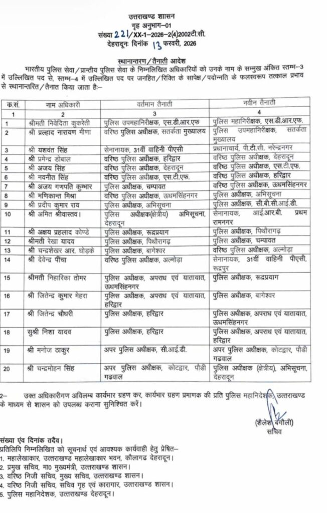 Uttarakhand: सीएम ने किया बड़ा फेरबदल, उत्तराखंड पुलिस महकमे में बड़े फेरबदल के पीछे सीएम धामी का साफ संदेश……देखें लिस्ट!