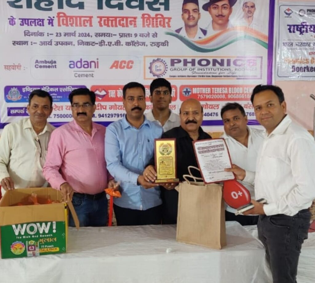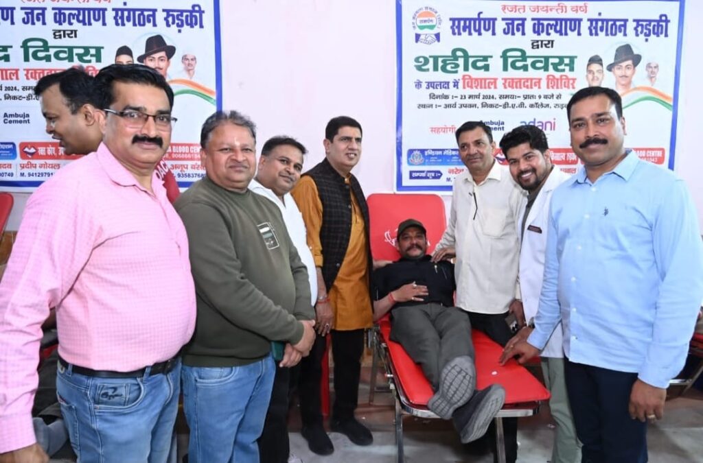 रुड़की l समर्पण जन कल्याण संगठन द्वारा रजत जयंती वर्ष में शहीद दिवस पर विशाल रक्तदान शिविर का आयोजन किया गया। इस शिविर में 270 से अधिक यूनिट रक्तदान हुआ। रक्तदान शिविर में नगर विधायक प्रदीप बत्रा, वरिष्ठ समाजसेवी सचिन गुप्ता, वरिष्ठ भाजपा नेता संजय अरोड़ा, पूर्व नगर पालिका अध्यक्ष दिनेश कौशिक, डॉक्टर संजीव अग्रवाल, डॉक्टर संजीव गर्ग, डॉक्टर विशाल, डॉक्टर सुरेंद्र कौशिक, डॉक्टर पिनाकिन कौशिक, विकास गोयल, अनिल नरलोनी आदि सहित भारी संख्या में अतिथि उपस्थित रहे और उन्होंने रक्तवीरों का उत्साहवर्धन किया। आज के रक्तदान शिविर में अंबुजा सीमेंट, अडानी सीमेंट, एसीसी सीमेंट, फोनिक्स ग्रुप आफ इंस्टीट्यूशंस, मदर टेरेसा ब्लड बैंक एवं अपोलो डायग्नोस्टिक लैब का विशेष सहयोग रहा। सुबह से आरंभ हुए शिविर में निरंतर भारी संख्या में रक्तवीर पूरे उत्साह के साथ रक्तदान के लिए आए। शाम तक भी रक्तवीरों के उत्साह में कोई कमी नहीं आई।
