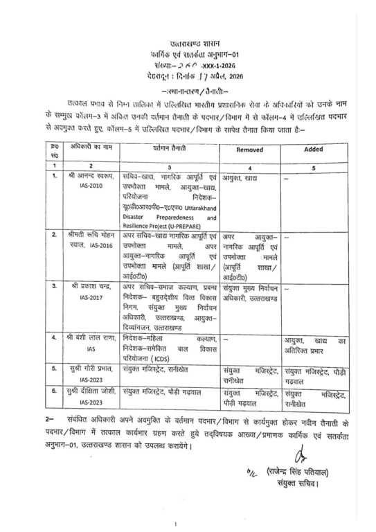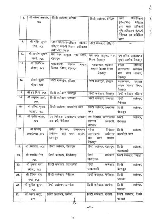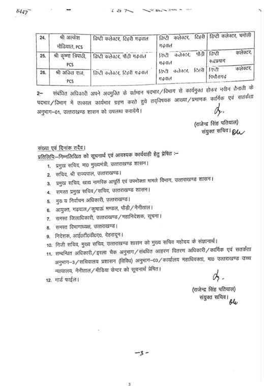 देहरादून। उत्तराखंड शासन कार्मिक एवं सतर्कता विभाग के संयुक्त सचिव राजेंद्र सिंह पतियाल द्वारा कई IAS और PCS के बंपर तबादलो की सूची जारी की है जिसमें भारतीय प्रशासनिक सेवा के अधिकारियों को उनकी वर्तमान तैनाती के पदभार अवमुक्त करते हुए अन्य पदभार/विभाग में तैनात किया गया है।