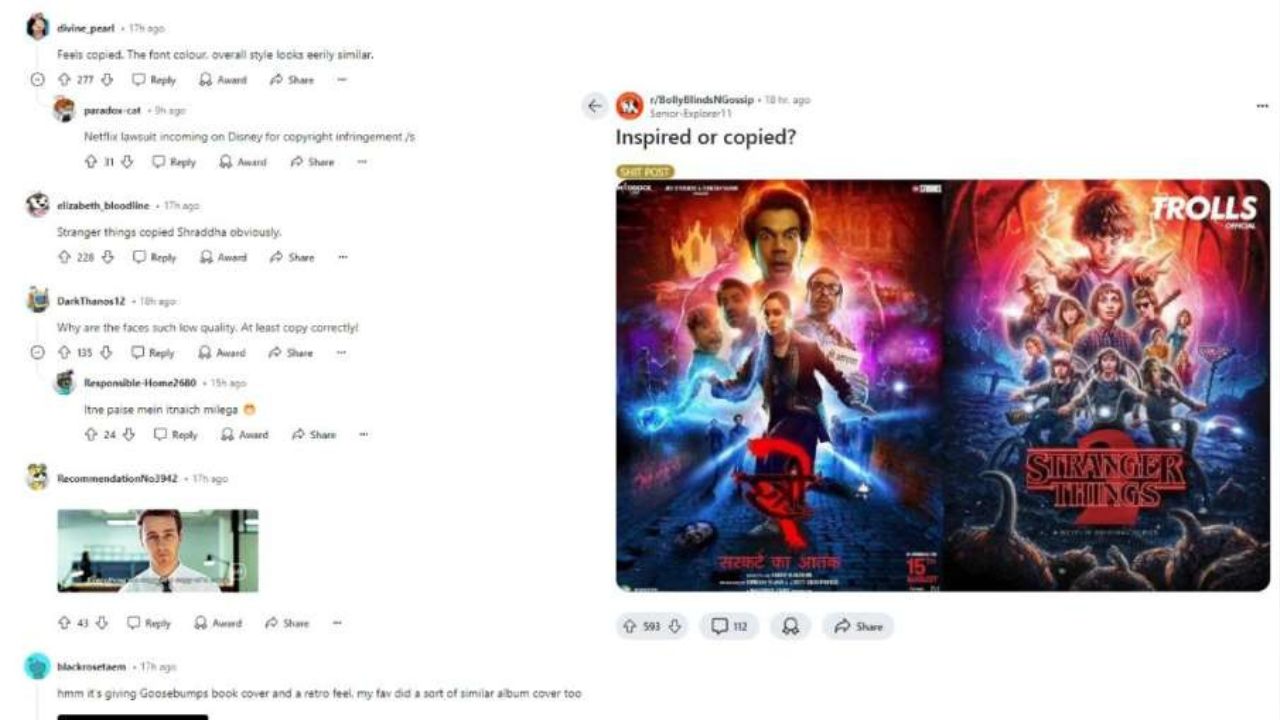 एक रेडिट यूजर ने इन पोस्टर्स की तुलना करते हुए लिखा, “आध्यात्मिक या कॉपी किया गया?” इसके बाद से ही सोशल मीडिया पर “स्त्री 2” के पोस्टर को लेकर कई प्रतिक्रियाएँ आ रही हैं।
